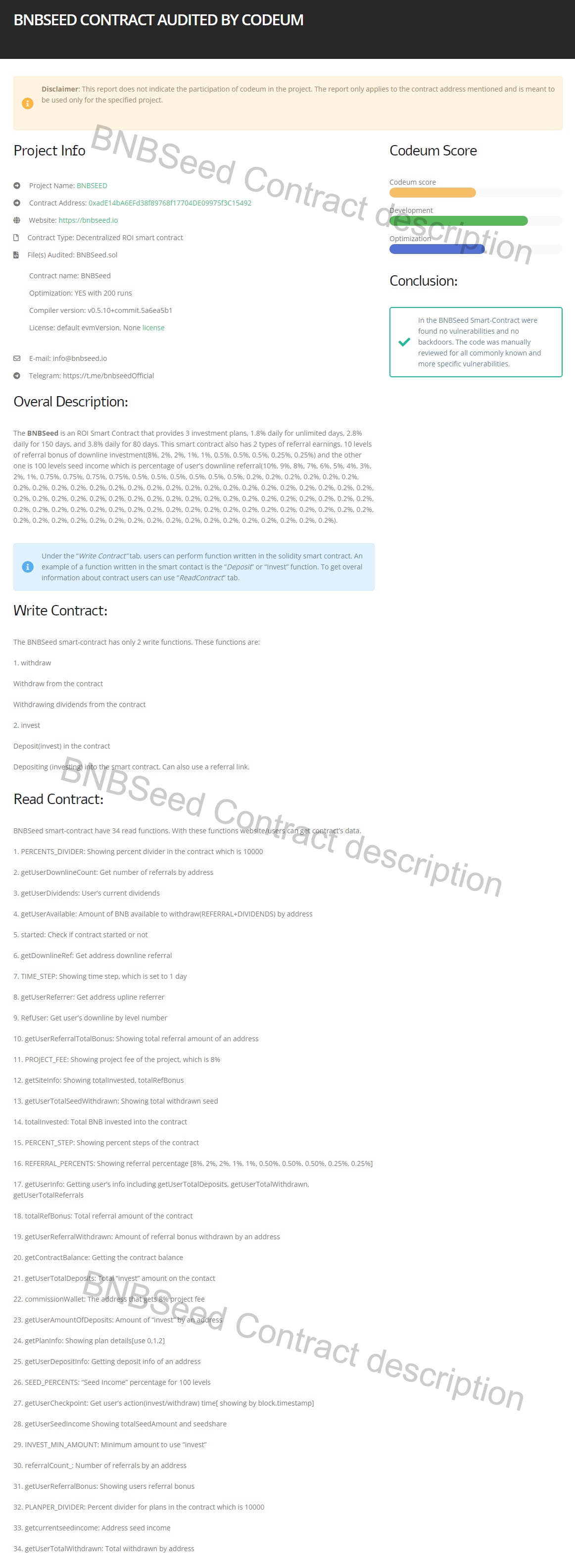 BNBSeed project is a decentrilized app on Binance smart chain. BNBSeed smart-contract has been audited by a third party auditor and it's verifed on bscscan. BNBSeed contract enables the use of BNB for use in yield investment industry. The sustainability of BNBSeed project will ultimately bring crypto users, miners, investors under single platform to stake, refer and earn seed income with unlimited opportunities making use of decentralization becomes a perfect yield platform which operates every second!